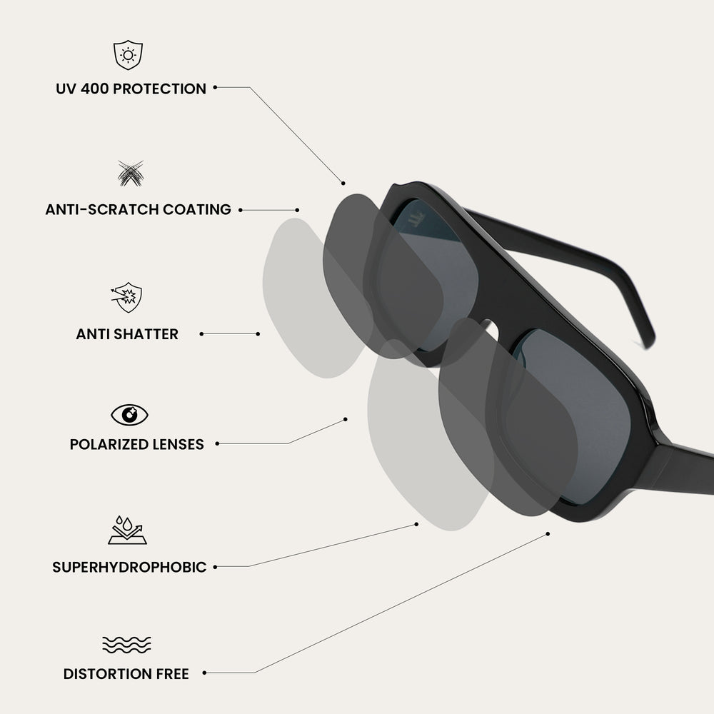 Polarised lenses reduce reflections from the sun on various surfaces, minimizing visual fatigue. They are equipped with AntiScratch coating technology, providing an extra layer of protection, improving resistance to heat, humidity, bumps, and scratches. The oleophobic coating layer ensures smoothness, making it difficult for dirt to adhere, and repelling water, oils, and sweat stains, easily wiped off without leaving a trace.Our sunglasses comply with the following quality standards: ISO 9001, ISO 9002, European Standard EN ISO 12312-1:2013, American Standard ANSI Z80.3:2008, and Australian Standard AS/NZS 1067:2003."